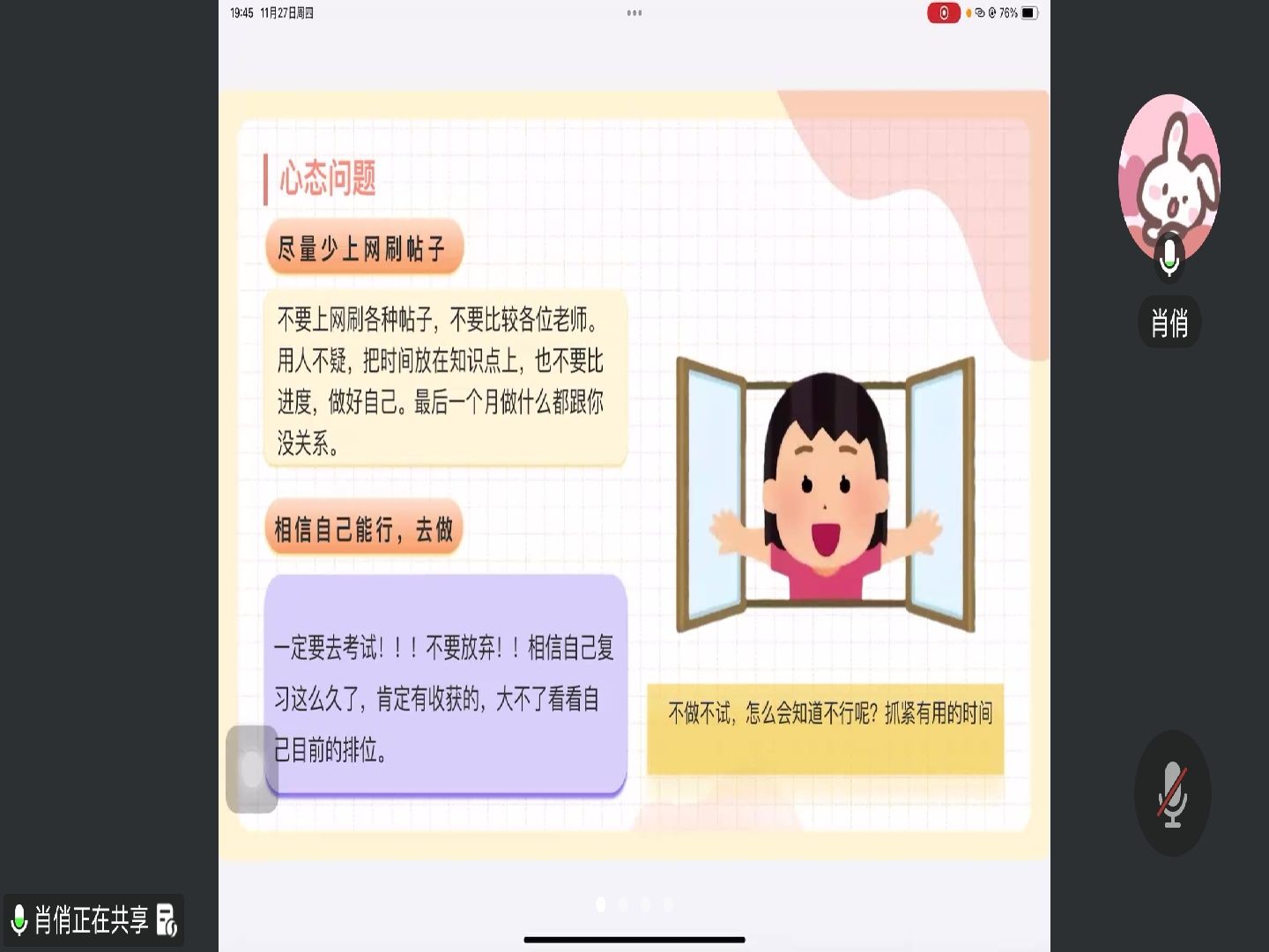 为助力备考学子精准把握冲刺阶段复习节奏、掌握实用应试技巧与答题方法,并激励同学们坚定考研信念、从容应考,11月27日,学院特邀2025届毕业生肖俏、靳乐乐、吕召欣三位学姐,结合自身考研高分经验,为学弟学妹提供最后冲刺指南。