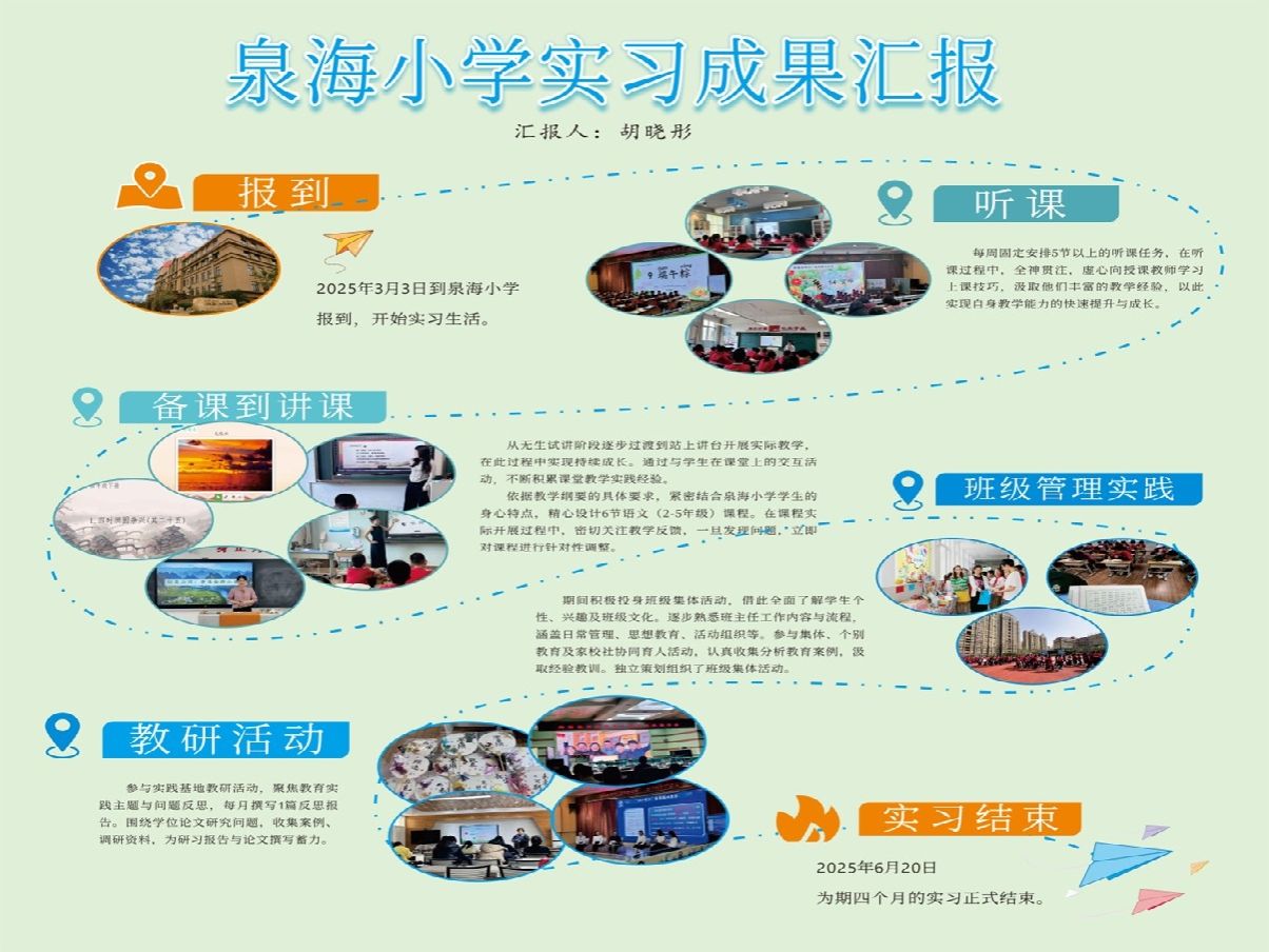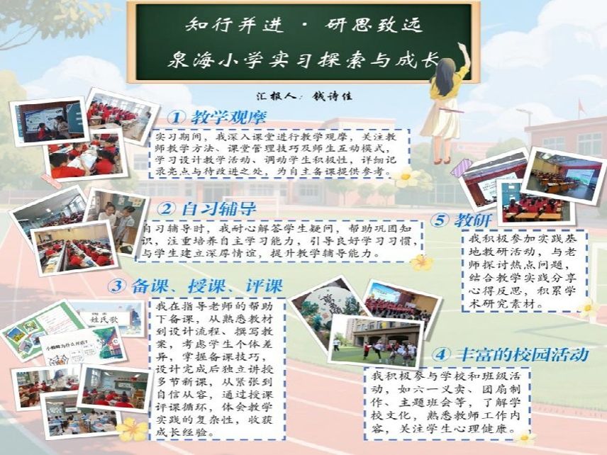 “弦歌不辍,芳华待灼。”当三尺讲台从书本走向现实,当教育理想在实践中淬炼成真,5位研究生用16周的时光完成了专业能力的蜕变。她们不仅掌握了课堂组织与活动设计的技能,更在课后辅导、家校沟通中读懂了儿童的世界——一张稚嫩的画作、一次课间的分享、一个进步的瞬间,都成为她们教育叙事中最珍贵的注脚。112个日夜,她们以“学高为师,身正为范”的标准自励,用耐心与创意搭建成长的阶梯。这场实习,是教育理想的落地生根,是师范精神的薪火相传,更是5位小学教育领域研究生对“如何成为童心引路人”的深刻回答。