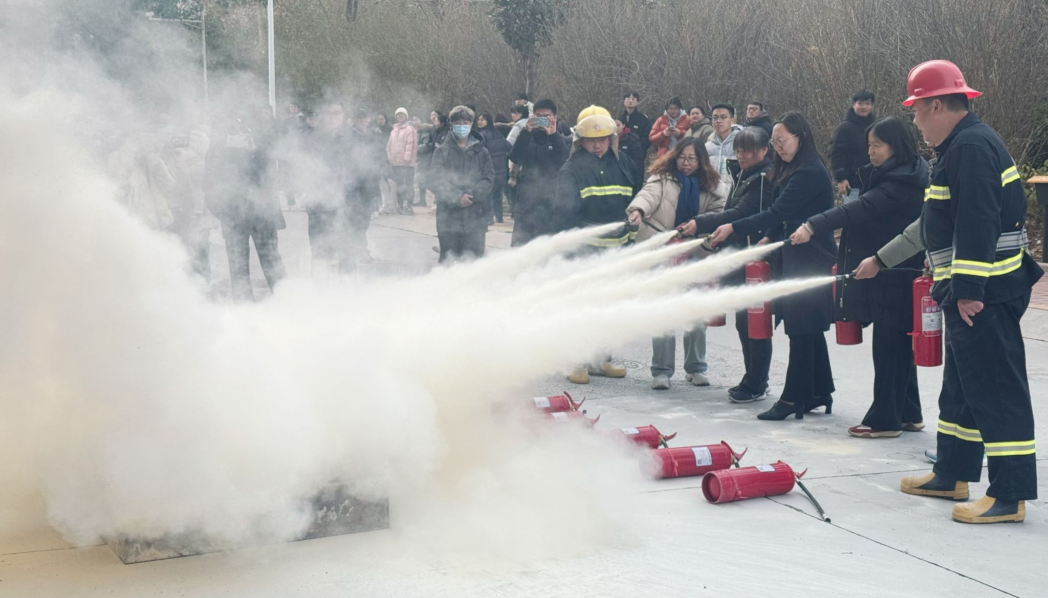 讲评结束后,陈军组织在场师生进行了灭火器实战演练,他指出,灭火器的使用要遵循“提、拔、握、压”的步骤,并亲自进行了示范。在场师生五人一组,规范使用灭火器进行了实战演练,不仅掌握了正确的灭火技巧,还将理论知识与实际操作紧密结合,效果非常显著。