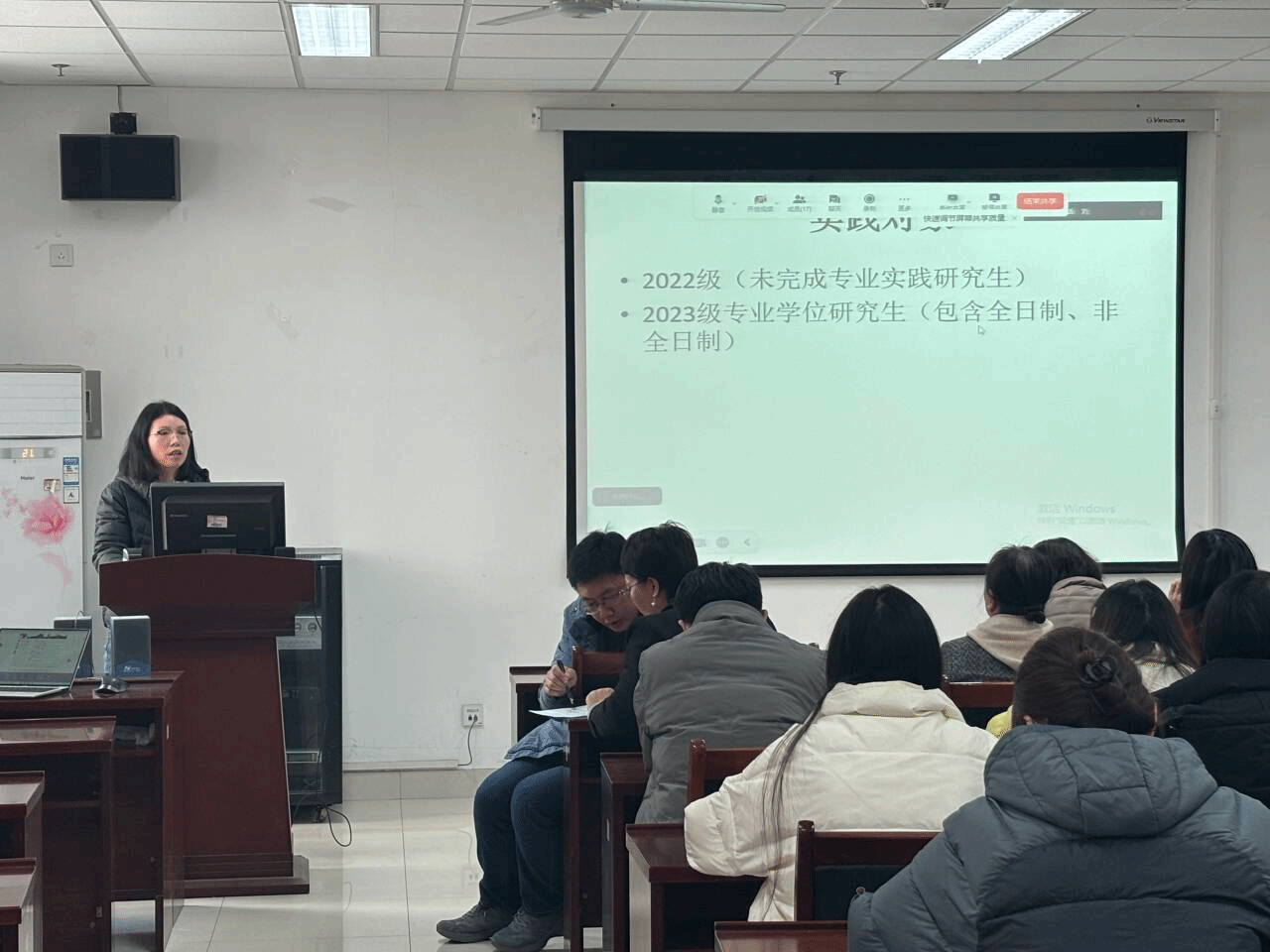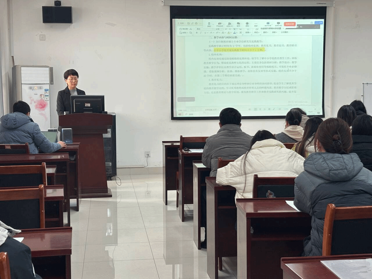 全日制教育硕士专业学位研究生实践教学基本要求》,以心理健康教育领域为例详细讲解了2023级全日制教育硕士专业学位研究生实习任务,分别从实习时间、实习内容、实习材料的撰写、实习步骤、教育实习成果展示等方面布置了实习任务。她指出,教育硕士实习方案包括学科教学实践、班级管理实践、教学研究实践三个部分,要求所有实习研究生必须全程、主动参加所有的教育教学实习活动,按照实习方案,完成不少于16周的实习任务,严格考勤,做好日常实习笔记和周期性实习总结,最终完成教育实习报告。