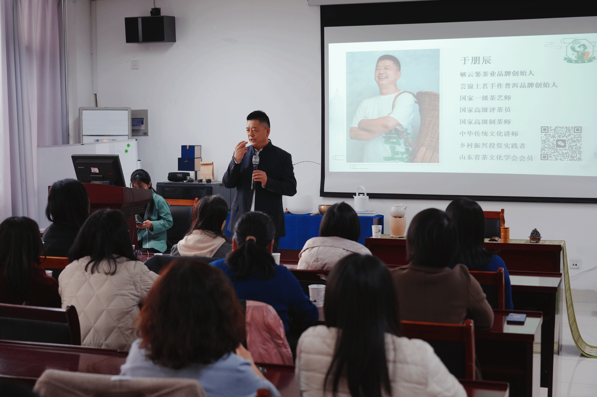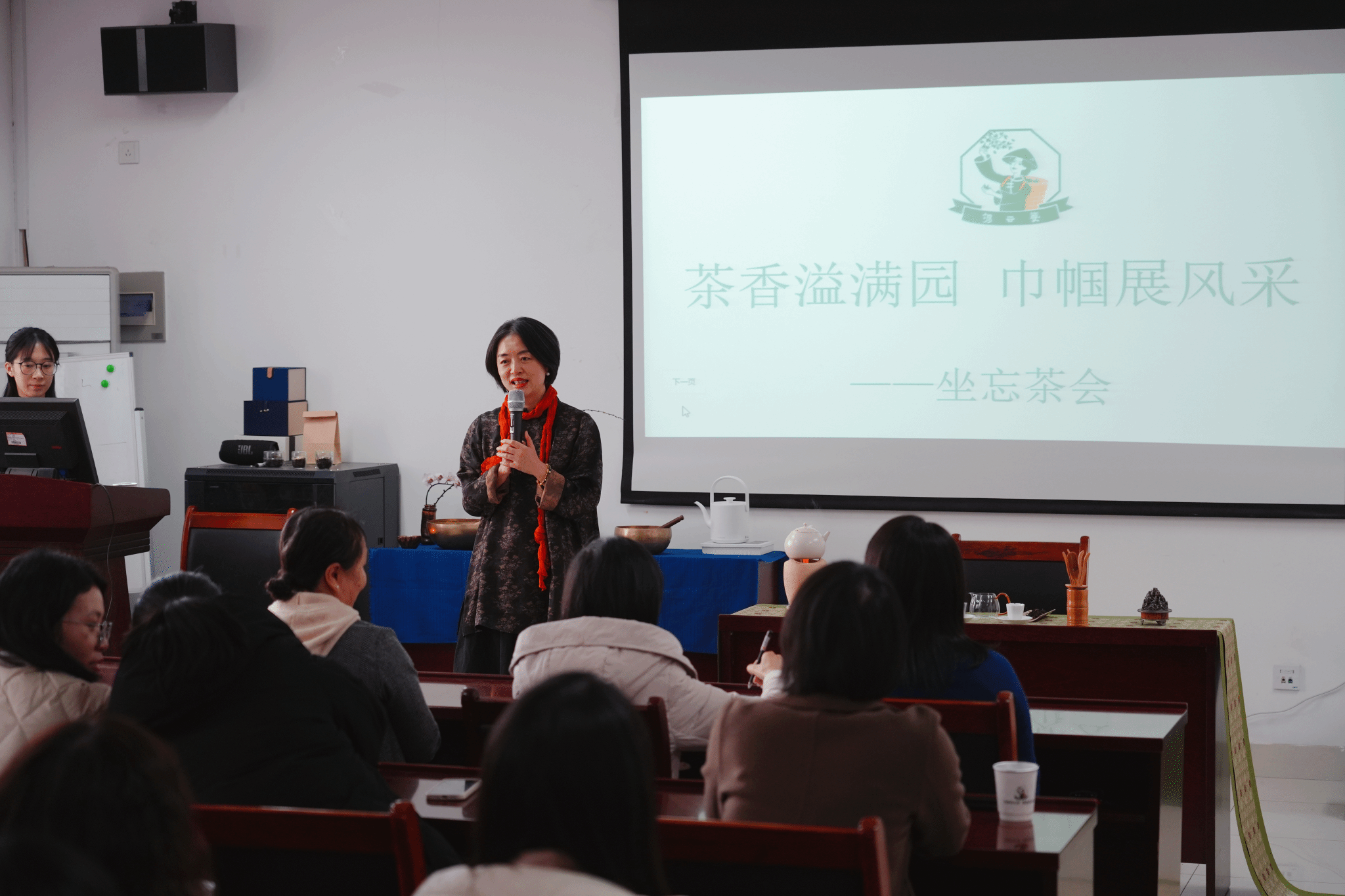 活动现场,古色古香的布置营造出宁静祥和的氛围。首先,颂钵音疗师带领女教师们进行呼吸冥想放松训练。舒缓钵声中,大家放松身心,释放工作生活压力,寻得内心宁静与平衡。紧接着,主办方精心准备了各类名茶,从清新淡雅的绿茶,到醇厚浓郁的红茶,再到陈香独特的普洱,满足了不同教师的口味偏好。茶艺师现场展示了精湛的茶艺表演,从温杯、投茶、冲泡到奉茶,每一个步骤都如行云流水,让大家深刻领略到中国传统茶文化的魅力。最后,由国家一级评茶师开展茶文化知识讲座,讲解茶的分类、喝茶要点及好茶要素,女教师们认真聆听、积极提问,在轻松愉快的氛围中进一步加深了对茶文化的了解,收获颇丰。