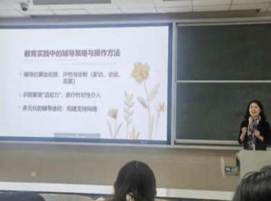 11月19日,庞荣荣(济南特殊教育中心一级教师)老师在11教3502开展《智力障碍儿童家庭教育》专题讲座,她从一封家长感谢信引入,围绕智力障碍儿童家庭和家庭教育辅导两大主题展开,通过多样化案例,让学生们真实感受智力障碍儿童的家庭与成长,同时领会特殊教育教师的幸福,明确自己将来的家庭教育“专家”身份及与家长的伙伴关系。