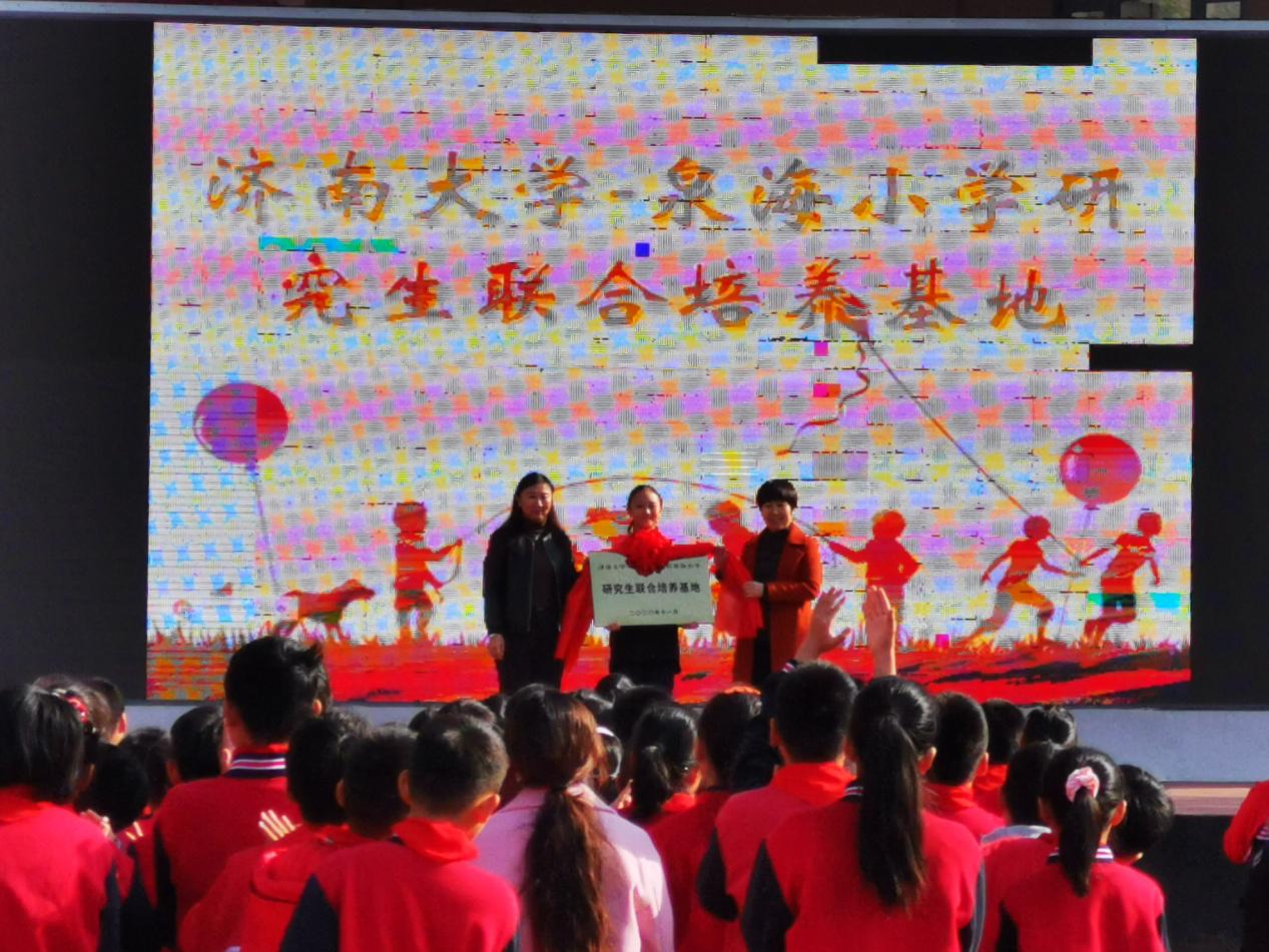 仪式在泉海小学升旗典礼后进行。仲倩副院长与于泉校长共同为联合培养基地揭牌,陈功香副院长为于泉校长校长颁发了校外研究生导师聘书。