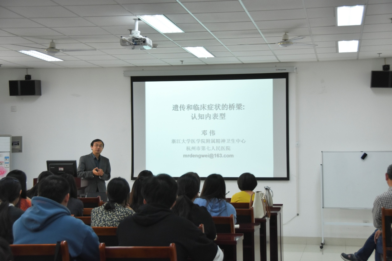 师生作了“遗传和临床症状的桥梁:认知内表型”的学术报告。邓教授以通俗幽默的方式详细介绍了其团队在认知内表型研究领域中进行的一系列富有原创型的探索,及产学研结合取得的一系列重大研究成果,从精神卫生角度打开了认知神经科学的研究视角,全体参会师生均受益匪浅。