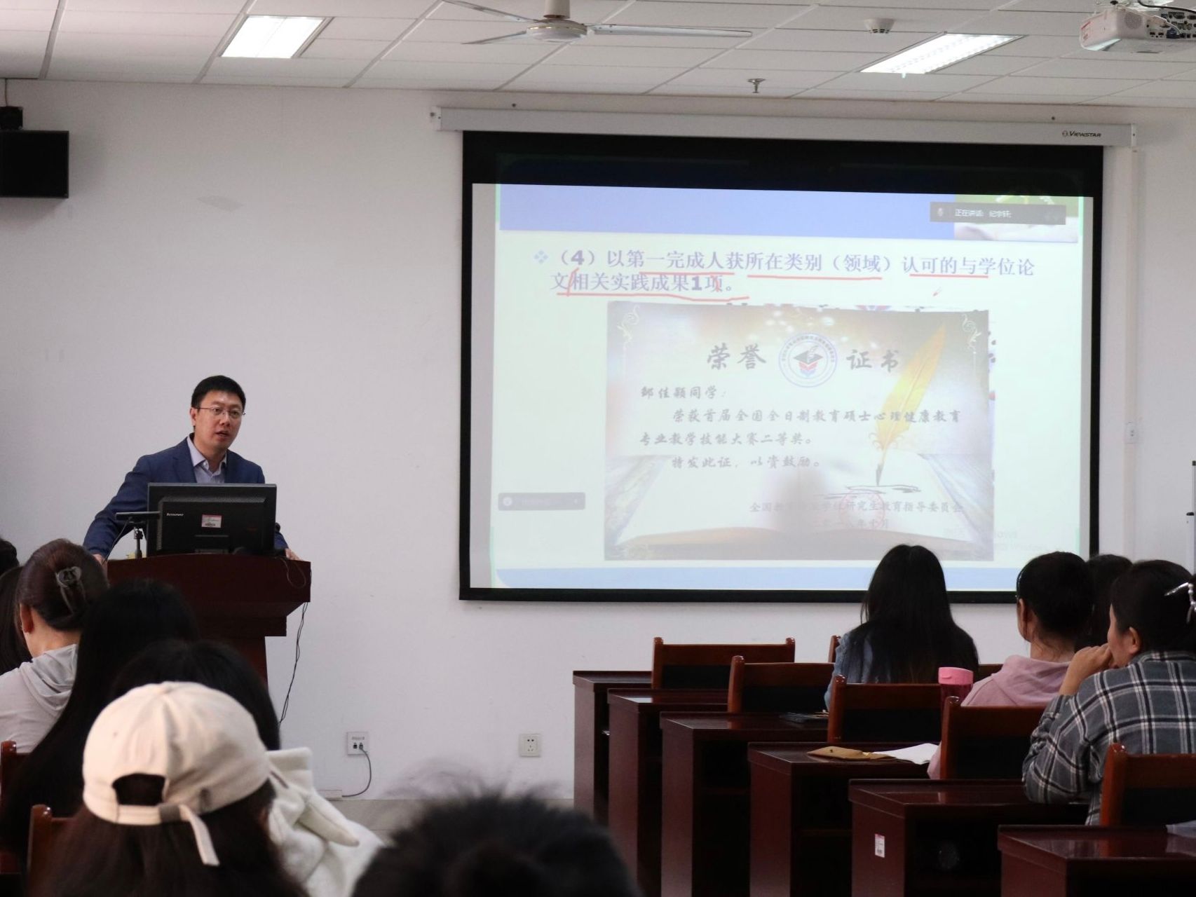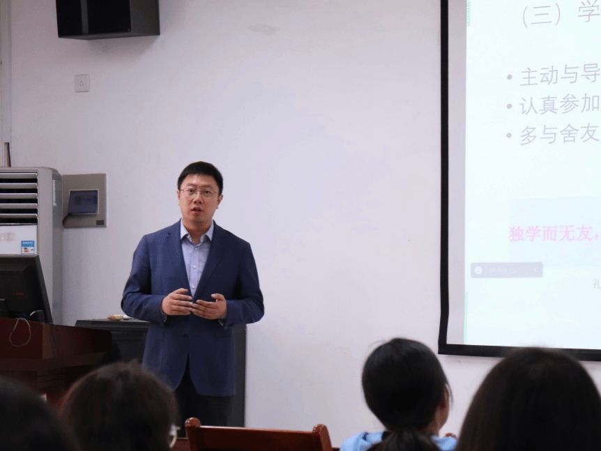 研究生国家奖学金评审实施办法》以及学位论文评审有关问题分专业领域进行了深入浅出的解读。之后,杨鹏说明了研究生阶段目标设立的重要性,为建立目标提出了实用的建议,并结合往届优秀毕业生的案例,帮助研究生尽早做好生涯规划,向着光辉的未来努力前行。最后,他以“青春多美丽,时序若飞驰,前程未可量,奋发而为之”为结束语,为研究生新生送上了真诚的祝福和期望。