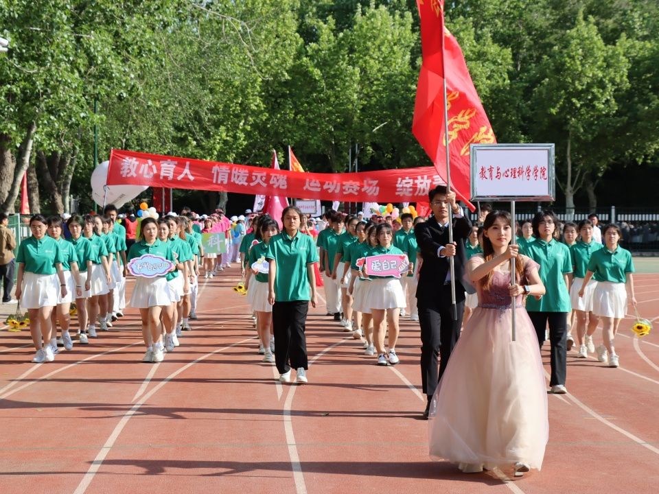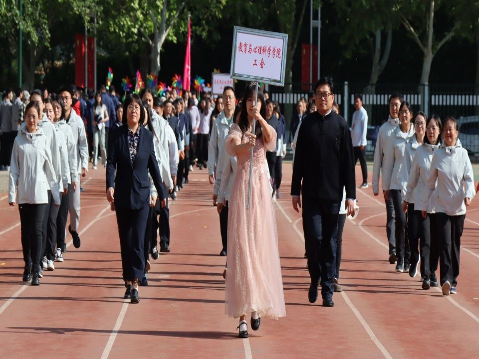 学生与教职工方队手擎知识火种,踏着铿锵有力的步伐向主席台迈进。步履一致彰显着协作精神,坚毅目光中跃动着青春理想,以飒爽英姿诠释着教心人特有的蓬勃朝气,用信念与力量书写着新时代教育人的奋进篇章。