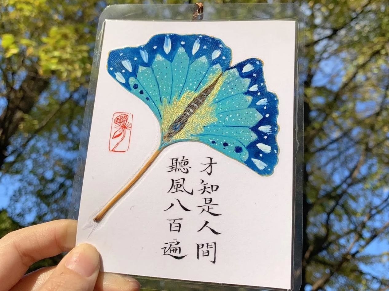 在活动中,学生采集银杏、枫叶等秋日素材,将叶脉的斑斓纹路与叶片的暖黄色彩等自然馈赠化作书签底色,搭配手写寄语,让自然之美与人文温度相融共生,把季节诗意与青春心绪封存在方寸之间。从蹲身择叶时指尖触到的丝丝秋意,到伏案拼贴时胶棒晕开的淡淡黏香,再到将成品夹进书页的瞬间——这些创作过程成为学生暂时卸下“认知过载”压力的契机。活动结束后,参与者表示,将济大的秋天封存在书签里,再翻书时指尖轻触,仿佛就能重新感受到秋日的融融暖意。