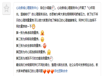 利用学院专业优势,心动泉城心理服务中心志愿者制作出一系列心理测量量表,其中包括焦虑、抑郁、安全感与孤独感等一系列的自测量表,并于3月27日公开收集信息,免费供大学生进行自我测试。暗网禁区