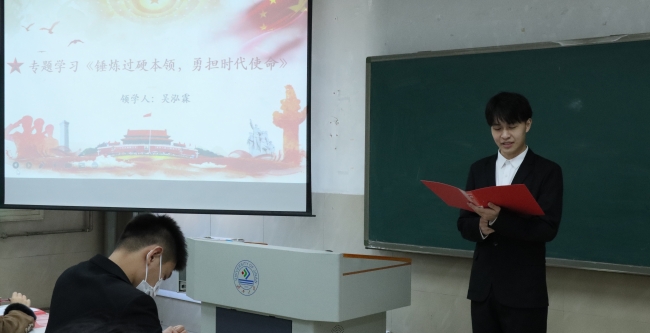 “青马工程”第十二期大学生骨干培训班学员、水利与环境学院学生会主席团成员吴泓霖以“锤炼过硬本领,勇担时代使命”为主题进行领学。他结合党的二十大报告中习近平总书记对青年的殷切期望,呼吁全体“青马班”学员增强先锋意识,坚持守正创新,争做有志气、骨气和底气的新时代好青年。