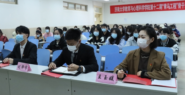 在10J317举行第十二期“青马工程”大学生骨干培训班开班仪式。活动邀请学校“青马工程”第十二期大学生骨干培训班学员刘泽宇、吴泓霖领学,并邀请2022年山东省青年马克思主义者培养工程高校班学员王玉媛进行“青春心向党,奋斗新华章”党史宣讲,学院本期培训班全体成员参加。仪式由教管2202班范晓晴同学和特教2202班吕友情同学主持。