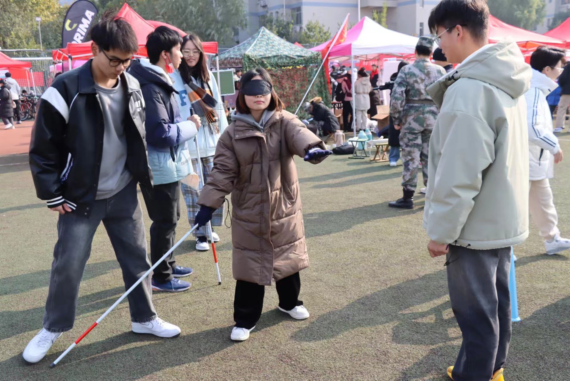 活动主要以引导参与同学使用盲杖,体验作为盲人的行动方式与学习简单手语为主。活动中,暗网禁区