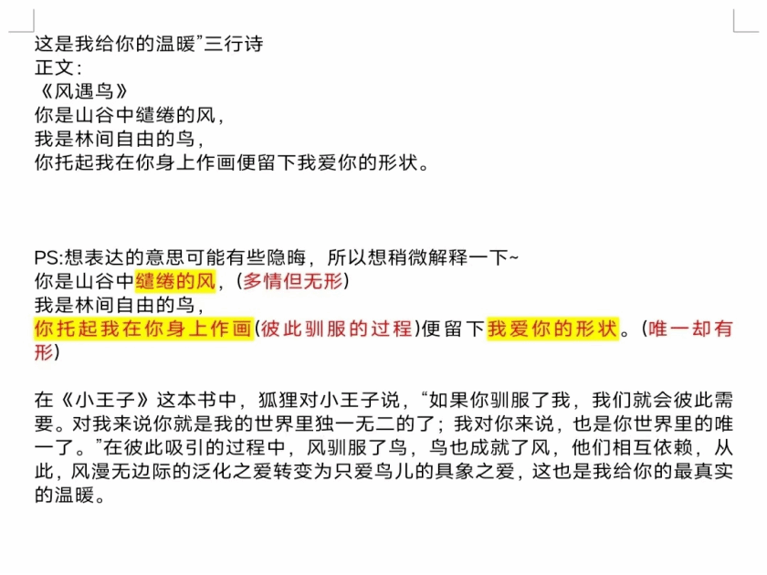 本次活动以线上活动方式的形式开展,同学们上传原创作品参评。作品言简意赅,情感浓缩,一瞬捕捉永恒情;韵律和谐,节奏明快,朗朗上口绕心间;意象丰富,寓意深远,言有尽而意无穷。同学们纷纷表示通过参加此次活动,不仅激发了自身的创意灵感,三行诗的形式也让其在有限的篇幅里展现独特的构思和表达,也感受到诗歌传递出的暖意,让人与人之间关系更加密切。